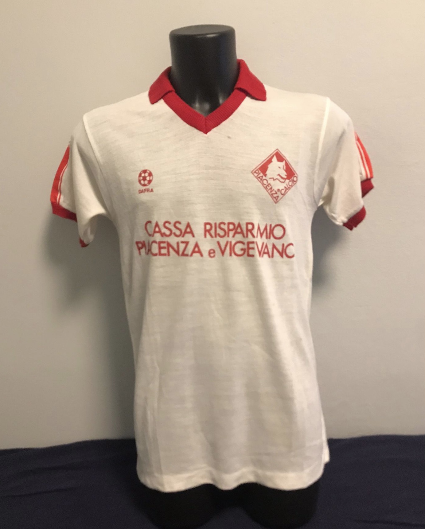 La maglia fu prodotta da Dafra ed è molto bella e semplice: è una maglia da trasferta in lanetta leggera, con colletto rosso e due bande sempre rosse in corrispondenza delle spalle che intersecano il bordo manica. Sul fronte della maglia troviamo il logo dello sponsor tecnico Dafra, lo sponsor commerciale, la Cassa di Risparmio di Piacenza e Vigevano e lo stemma del club, la lupa capitolina stilizzata che si rifà allo stemma comunale con la lupa in onore alla fondazione in epoca romana dopo la conquista della regione dai Galli vinti da Cesare. Lo stesso stemma del club lo troviamo su entrambe le maniche, al centro della banda rossa sopra richiamata. Il numero 8 è applicato in plastica pesante sul retro della maglia.