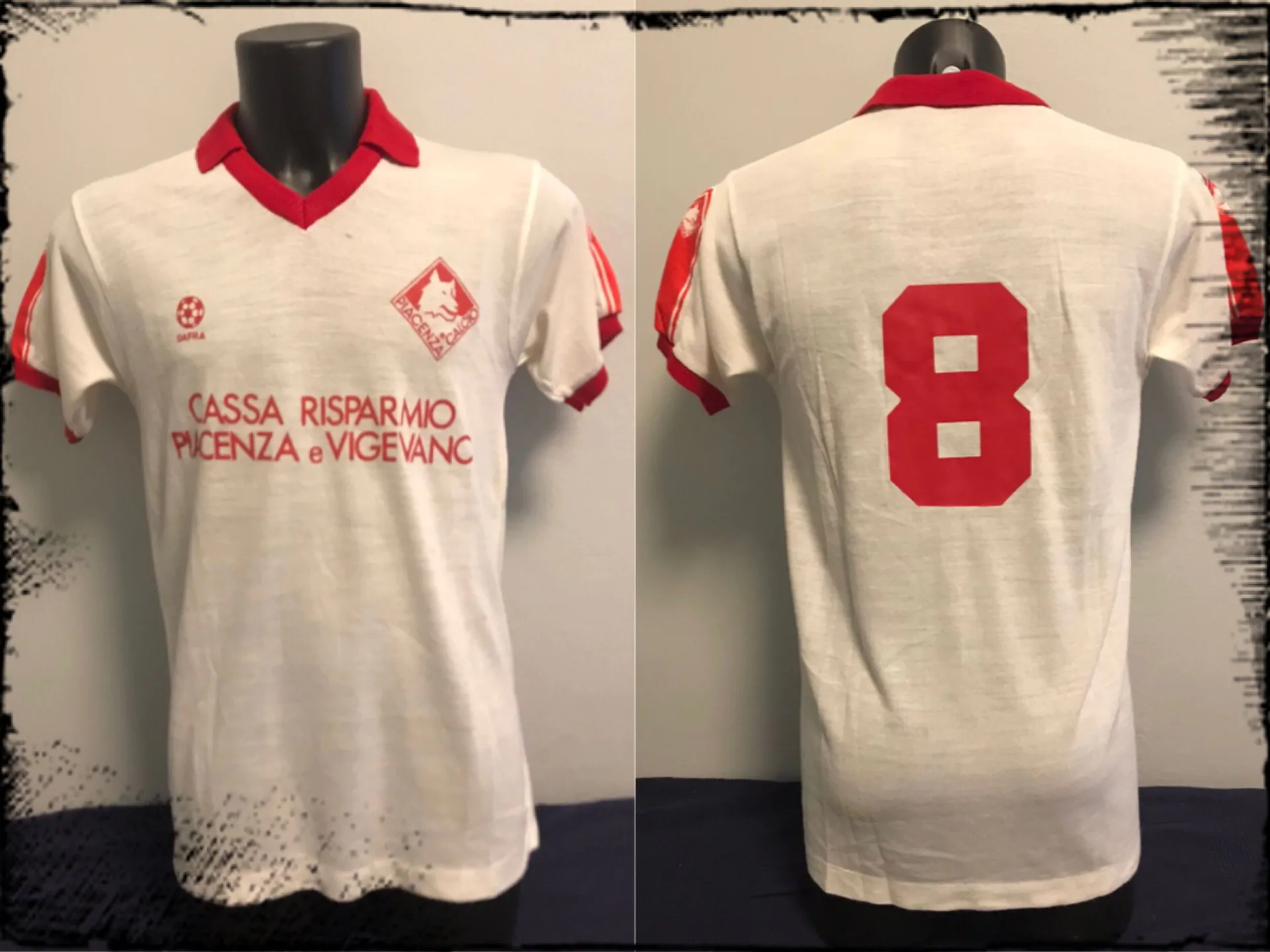 La maglia fu prodotta da Dafra ed è molto bella e semplice: è una maglia da trasferta in lanetta leggera, con colletto rosso e due bande sempre rosse in corrispondenza delle spalle che intersecano il bordo manica. Sul fronte della maglia troviamo il logo dello sponsor tecnico Dafra, lo sponsor commerciale, la Cassa di Risparmio di Piacenza e Vigevano e lo stemma del club, la lupa capitolina stilizzata che si rifà allo stemma comunale con la lupa in onore alla fondazione in epoca romana dopo la conquista della regione dai Galli vinti da Cesare. Lo stesso stemma del club lo troviamo su entrambe le maniche, al centro della banda rossa sopra richiamata. Il numero 8 è applicato in plastica pesante sul retro della maglia.