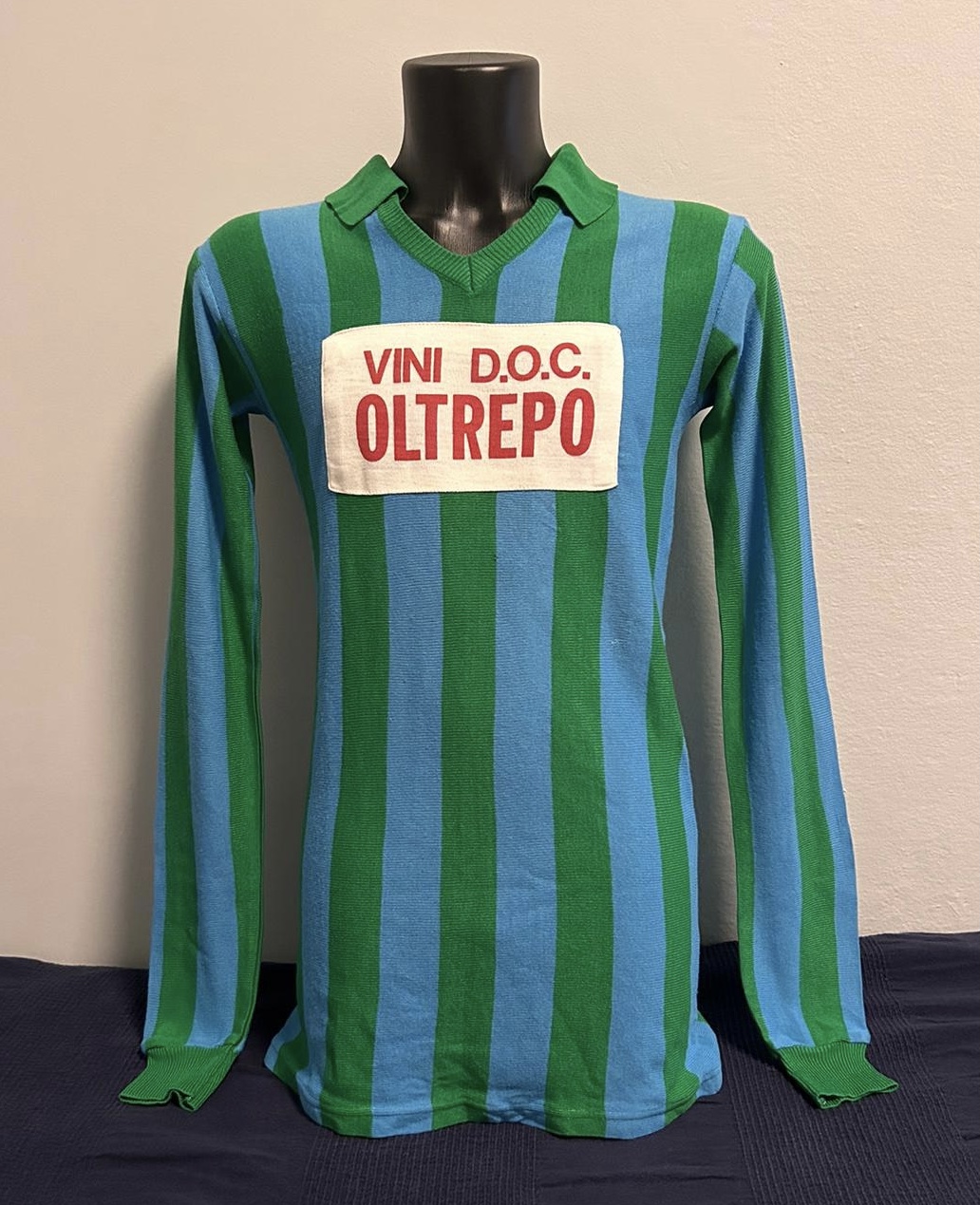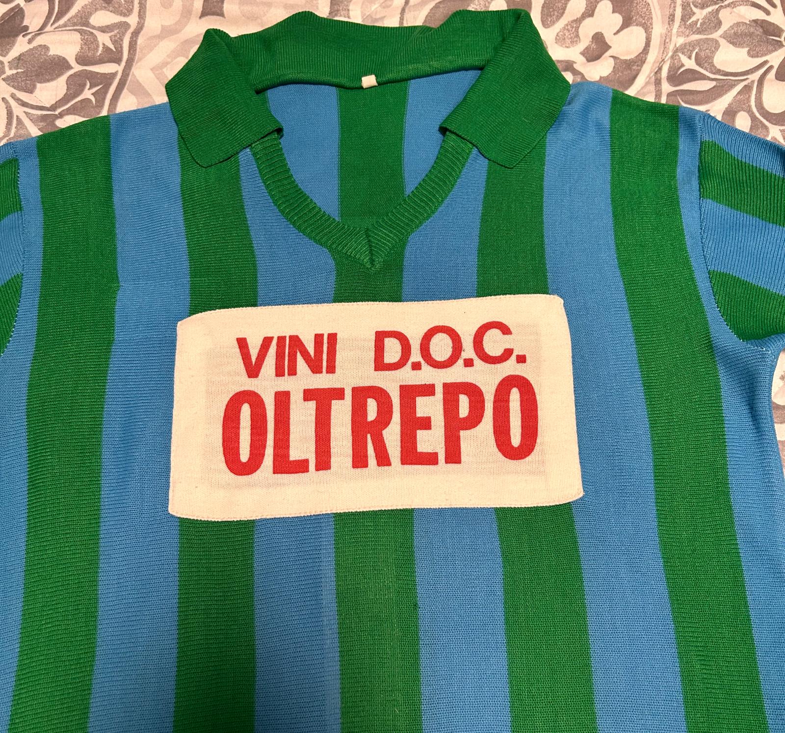 La maglia è quella dell’ormai scomparsa Unione Sportiva Oltrepò, squadra originaria di Stradella, in provincia di Pavia ed appunto in quella parte di provincia denominata Oltrepò Pavese. Si tratta di una maglia con dei colori poco usuali e con un accostamento cromatico molto particolare: il verde e l’azzurro. Con questa tipologia di colori sociali abbiamo in Italia pochissimi esempi: a memoria ricordo solamente la Nuorese e la Feralpi Salò.