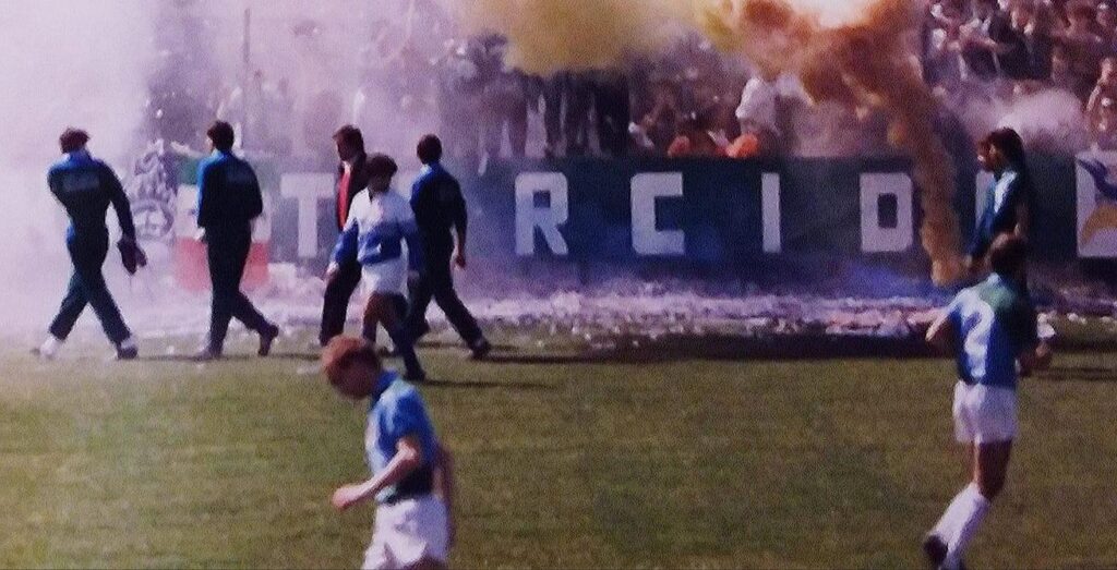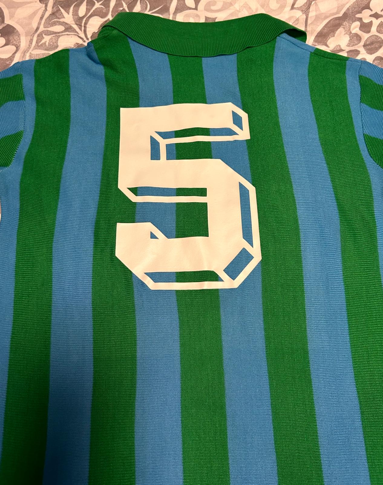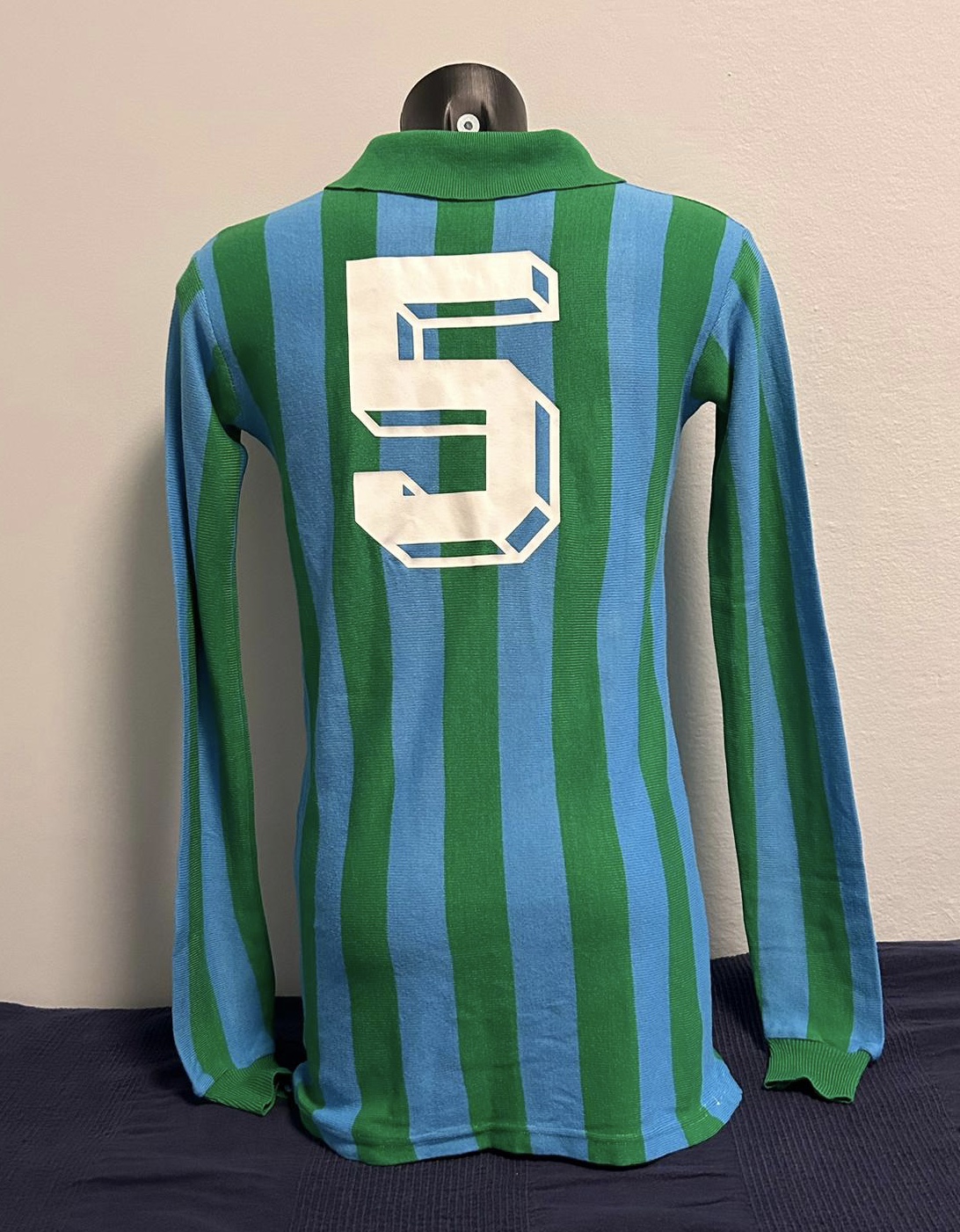 Questa maglia risale all’inizio del periodo aureo per questa piccola compagine lombarda, vale a dire la stagione 1985-86 che vide la promozione in serie C2 del team verdeazzurro, vittorioso del girone B del Campionato Interregionale con 41 punti finali davanti alla Intim Helen Telgate (in foto una rara istantanea del match). Il miglior piazzamento della storia sarà il quinto posto conseguito nel campionato di serie C2 girone A, vinto da Casale ed Alessandria. I professionisti saranno salutati dalla compagine stradellina nella stagione 1992-93.