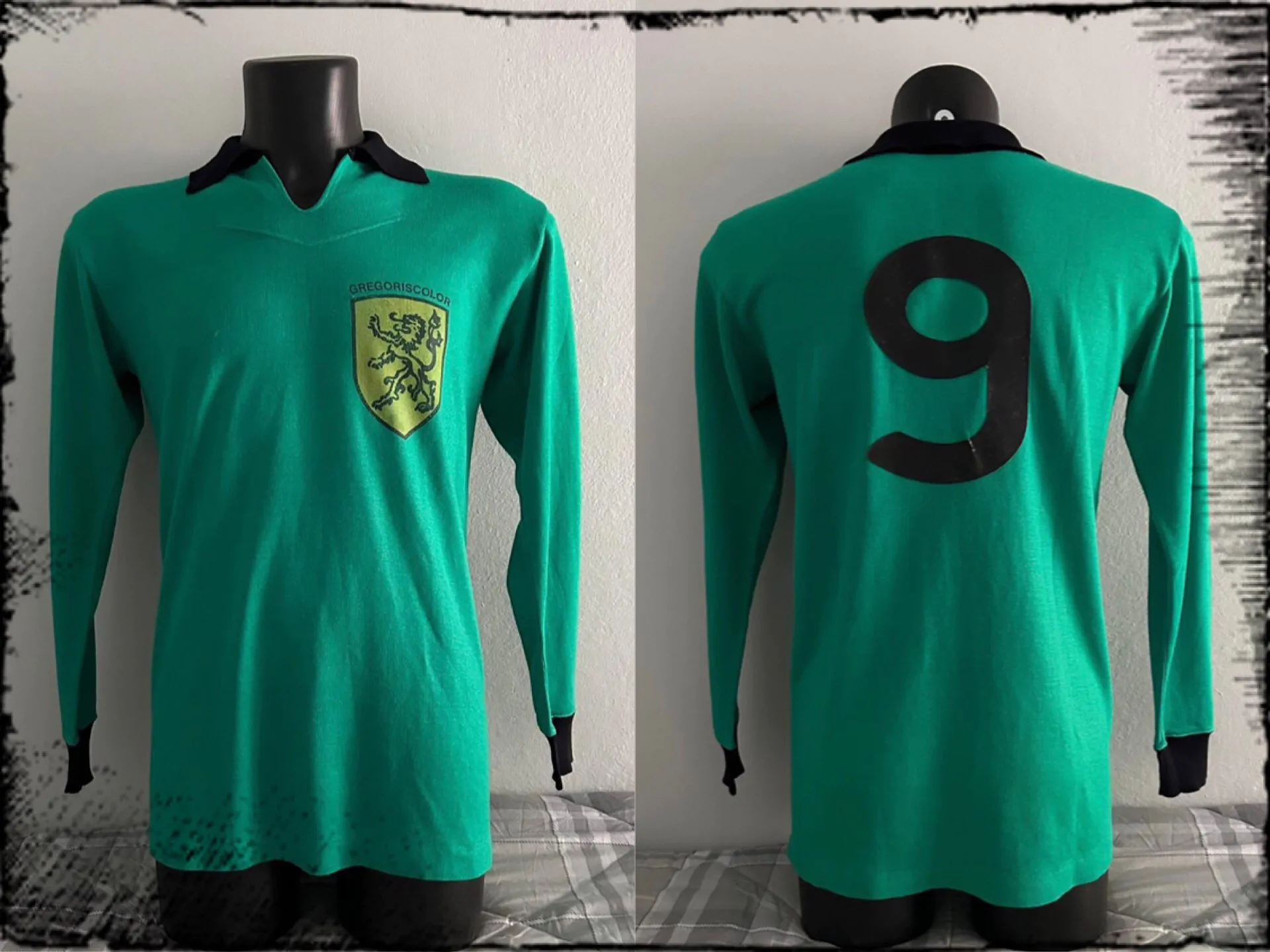 La maglia è di ottima fattura, essendo stata prodotta dal maglificio Lama. È un modello invernale in acrilico pesante con il tipico scollo a V alla base del colletto nero. Il numero 9 sul retro è nero cucito in similpelle. Lo stemma è molto particolare, il leone rampante, altro legame con Venezia, ma soprattutto simbolo dell’azienda del presidente di allora Giuseppe Gregoris. Appena sopra lo stemma del leone rampante, troviamo uno degli sponsor più piccoli mai visti, la Gregoris Color, azienda operante nel mondo della fotografia e fallita poi nel 1994.