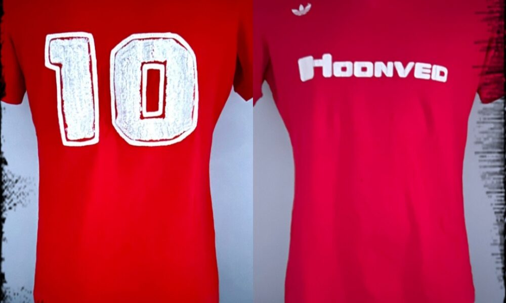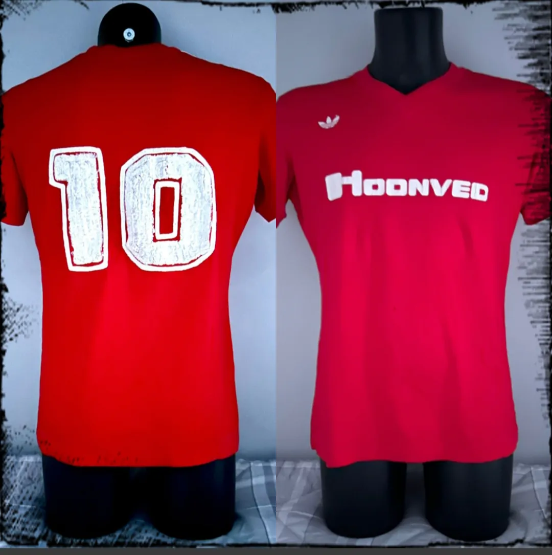 La maglia è davvero bellissima nella sua semplicità. E’ stata prodotta da Adidas ed è in un tessuto elasticizzato. Completamente rossa, reca le consuete strisce biancorosse sulle spalle e sulle maniche. Al centro della maglia, oltre al trifoglio dell’Adidas in bianco, troviamo, in versione stampata in vernicetta, il primo storico sponsor del club lombardo, la Hoonved, un’azienda della provincia di Varese, con sede a Venegono Superiore, che dal 1965 produce elettrodomestici ed in particolare lavastoviglie. Il nome Hoonved prende ispirazione dal mondo calcistico. Honved, infatti, è il nome della squadra dell’esercito ungherese di Budapest che, nel 1954, arrivò con la propria nazionale a un passo dalla vittoria della Coppa del Mondo. La grinta e lo spirito battagliero della Honved colpirono tanto il fondatore dell’azienda, Erminio Dall’Oglio, che aggiunse una “o” al nome della squadra ungherese per creare la propria azienda. Hoonved accompagnò la formazione varesina fino alla stagione 1983/84.