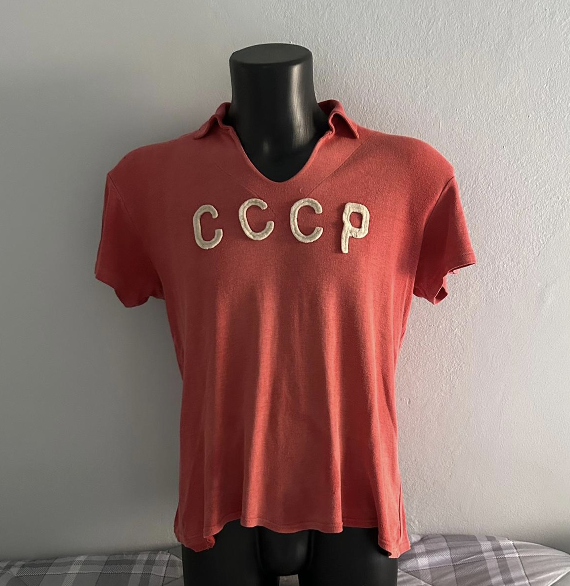È una bellissima maglia degli anni 70, molto semplice e artigianale, il che riflette molto l’epoca in cui fu indossata, in piena guerra fredda e con un regime molto rigido e rigoroso soprattutto nella condivisione di beni non di primaria necessità e soprattutto di provenienza occidentale. La maglia infatti è proprio artigianale, non è stata prodotta da nessun maglificio noto, né tantomeno quelli che rifornivano le squadre dell’Ovest; è di un cotone abbastanza dozzinale, larga ma non molto lunga, ovviamente ciò anche ai segni del tempo e reca la scritta in alfabeto cirillico CCCP, vale a dire l’acronimo delle parole russe Сою́з Сове́тских Социалисти́ческих Респу́блик, cioè Unione delle Repubbliche Socialiste Sovietiche.