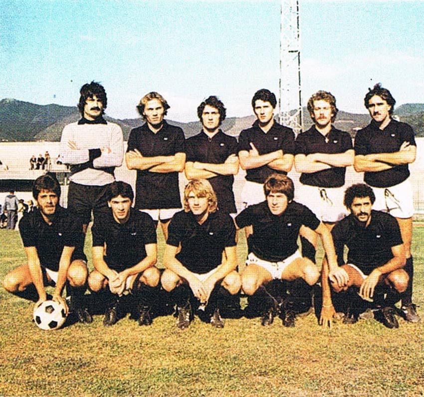 Lo stesso modello di maglia fu utilizzato dalla squadra anche per la successiva stagione 1979-80 e, addirittura, nella stagione 1984-85 lo stesso modello a manica lunga fu utilizzato per alcune partite (in foto un’istantanea del derby al Vestuti di Salerno). Sul retro-maglia troviamo altro retaggio delle maglie Ennerre degli anni 70, costituito dal numero 4 in similpelle, ancora non sostituito da quello in panno.