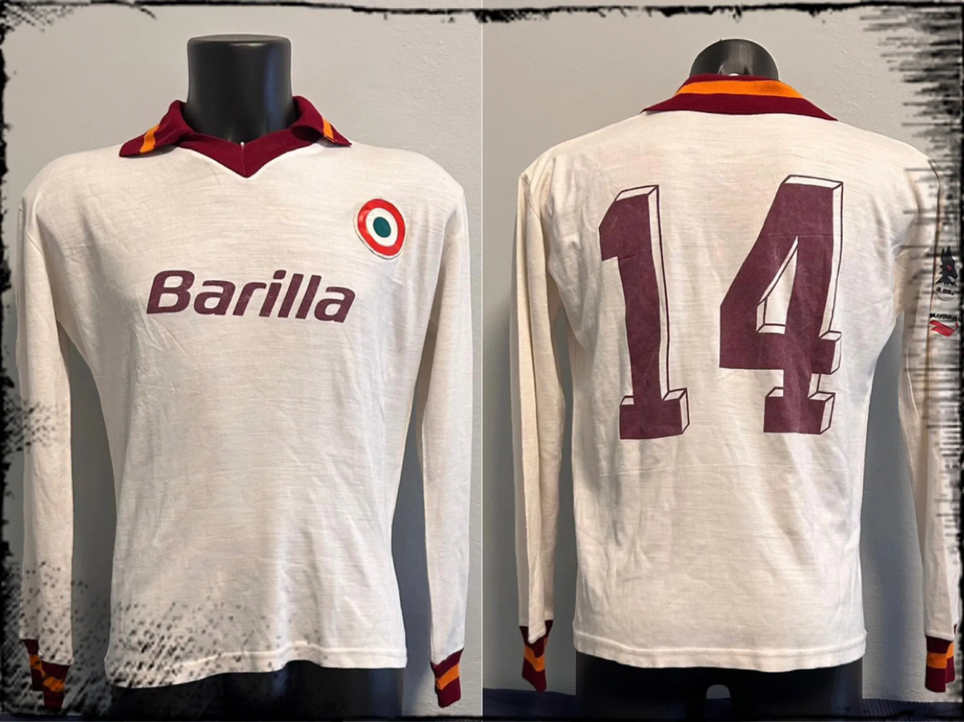 La maglia è impreziosita dalla grande coccarda in plastica della Coppa Italia vinta l’anno precedente ai calci di rigore contro il Torino (la Roma, peraltro, era già detentrice della Coppa) e dalla comparsa dello storico sponsor commerciale “Barilla”, l’azienda alimentare di Collecchio (Parma) che legherà il proprio marchio a quello dei capitolini per ben 13 anni fino al 1994. Lo sponsor, così come il numero tridimensionale sul retro, è stampato di un colore amaranto. Molto bello il colletto a polo che, insieme ai polsini, richiama i colori sociali giallorossi. A metà della manica destra troviamo cuciti sia il lupetto di Gratton sia l’etichetta della Playground.
