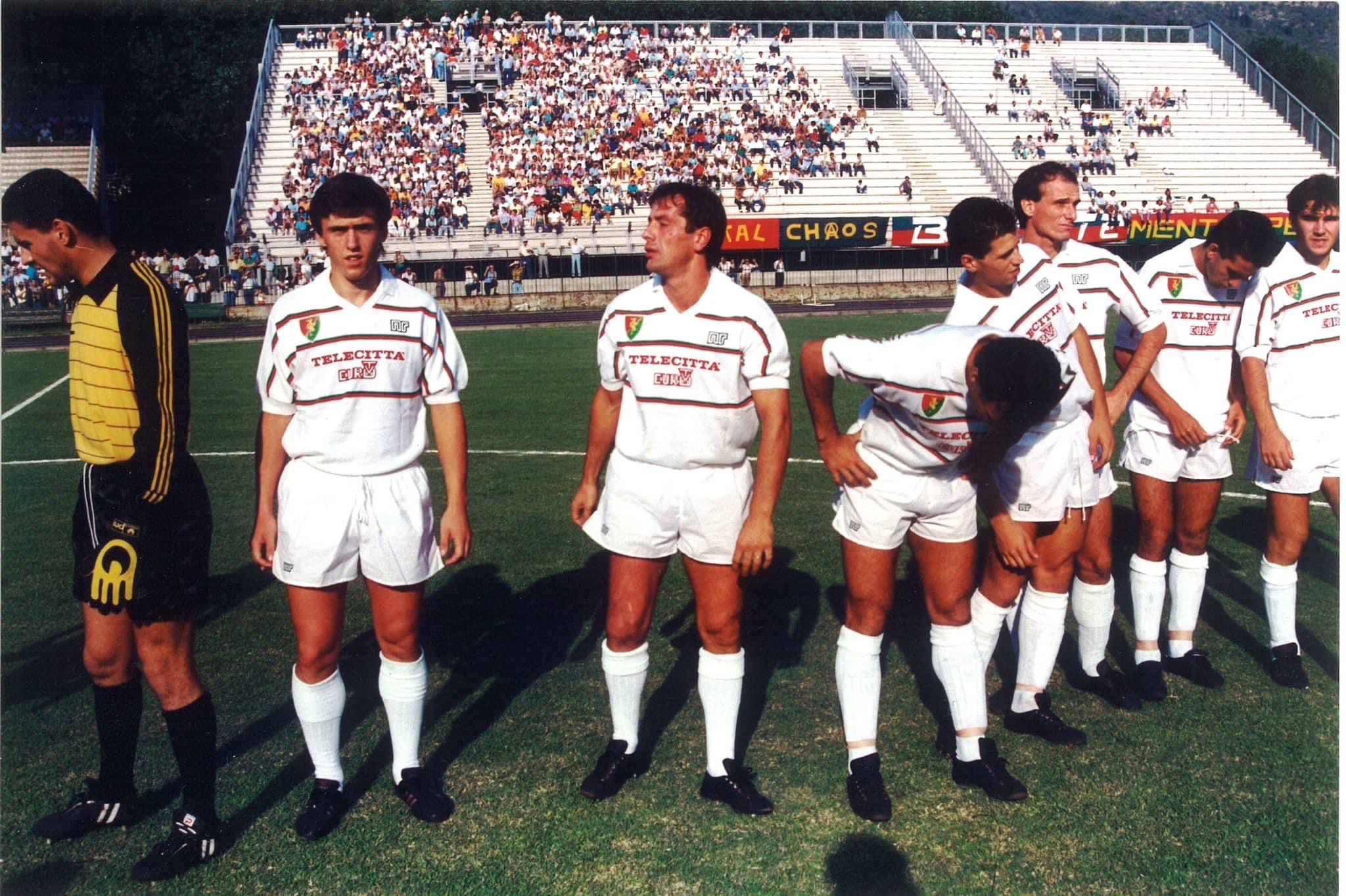 La squadra rossoverde disputò in quella stagione il campionato di serie C2 girone C ed era a forte connotazione laziale: innanzitutto il mister era il compianto Mario Facco, ex giocatore biancoceleste oltre che poi nota seconda voce nel posticipo del lunedì sera delle partite di serie C su Rai Sport Sat, ma anche la rosa era di tutto rispetto, potendo vantare tra le propria fila il talentuoso Vincenzo D’Amico, ormai a fine carriera, a cui dedico questo post con l’augurio di una pronta guarigione, la giovane seconda punta Paolo Di Canio, proveniente dal settore giovanile biancoceleste e l’attaccante Antonio Ravot.