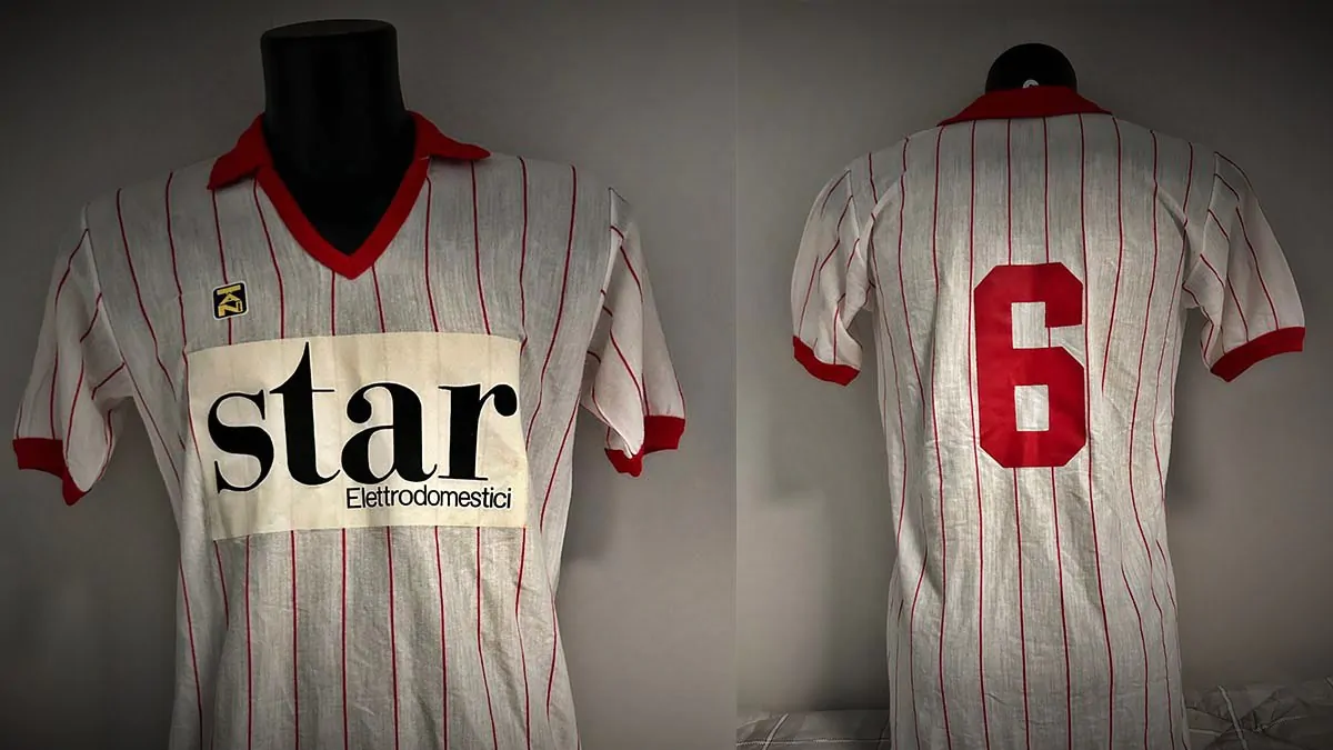 E’ una maglia da trasferta a manica corta in lanetta leggera, bianca con le righine verticali rosse, stesso colore del colletto, del bordo manica e del numero 6 sul retro. La maglia è marchiata TAN Sport, che avevamo già conosciuto già in occasione della presentazione della maglia dell’Ancona: è un negozio di articoli sportivi di Rimini, tuttora attivo. Sul fronte maglia, troviamo applicata una toppa in vellutino con lo sponsor commerciale: la ditta di elettrodomestici STAR, acronimo di Società Trevigiana Apparecchi Riscaldamento: società con sede a Refrontolo (TV) poi assorbita dalla marchigiana Merloni, divenuta poi Indesit e poi Whirlpool.