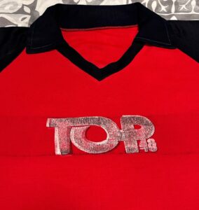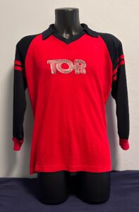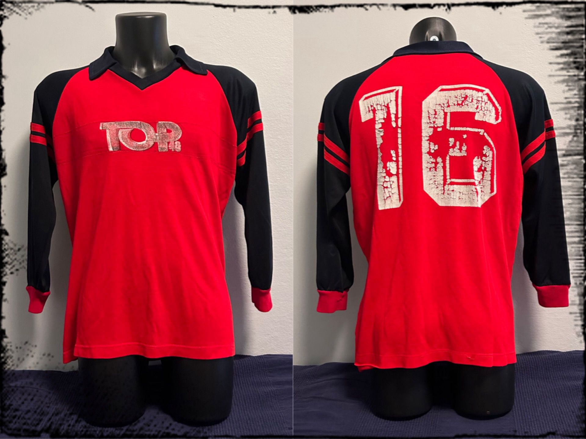 In particolare, la parte centrale della maglia è rossa, colore poi richiamato anche in due strisce orizzontali sulle maniche lunghe che invece sono nere e sui polsini. Il colletto si presenta invece nero come le maniche. Al centro della maglia troviamo il vecchio e primo sponsor in vernicetta, la TOP 43, in precedenza coperto da una toppa cucita alla maglia con lo sponsor “Valdata” utilizzato la successiva stagione 1982-83.