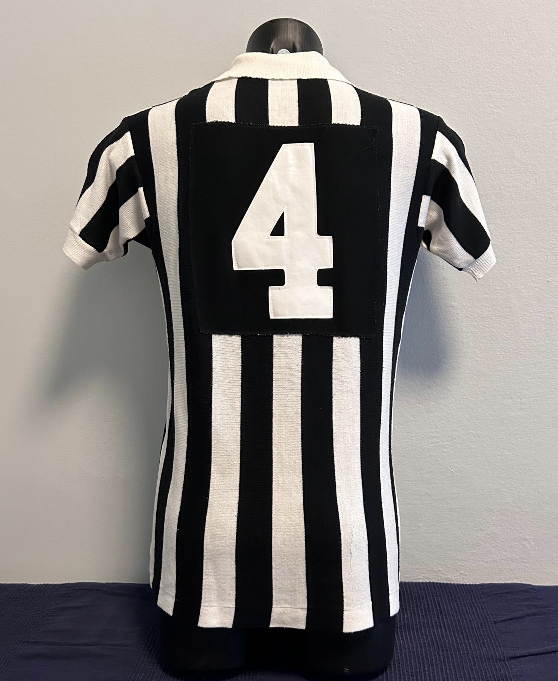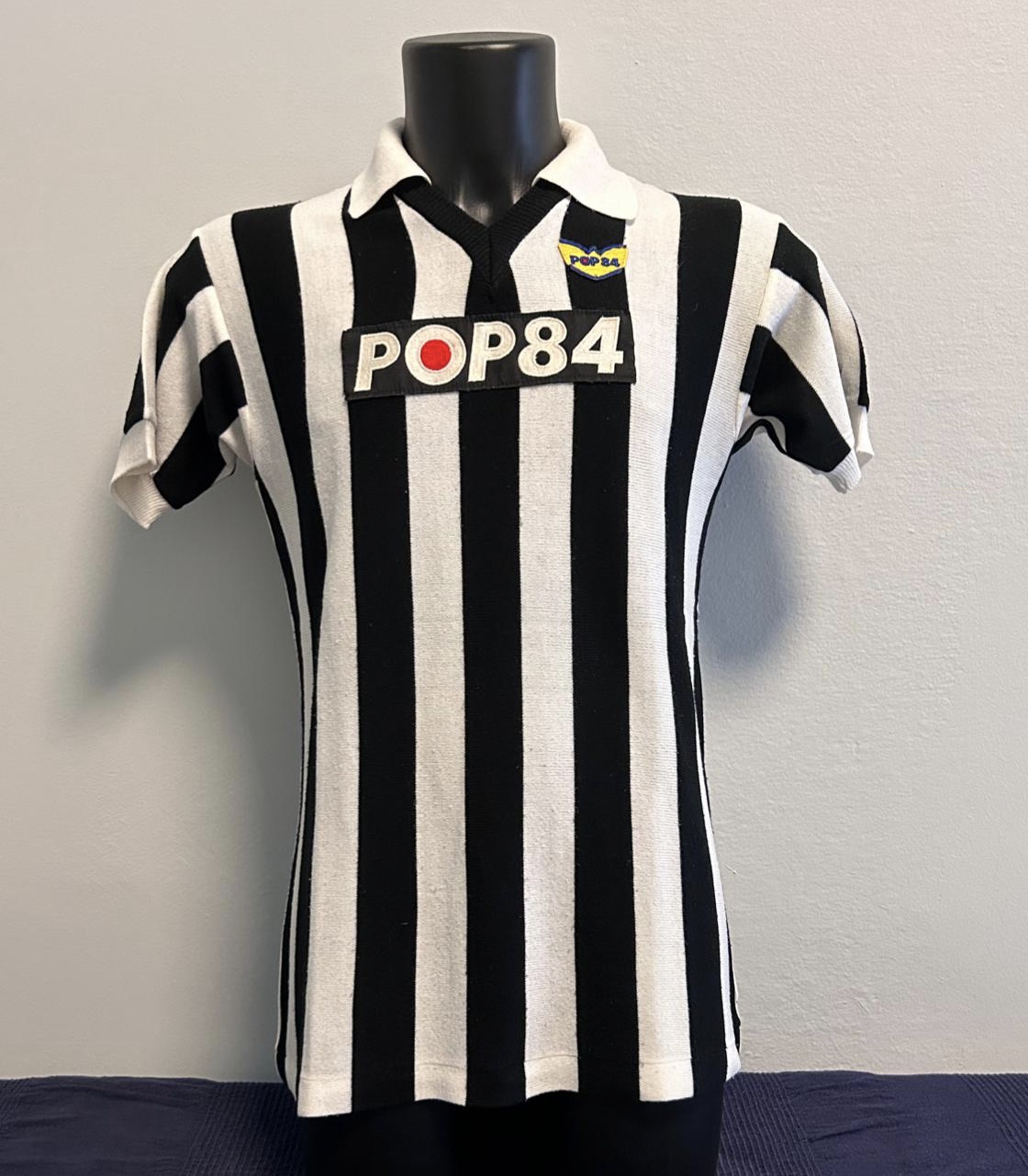 Si tratta di un modello simile a quello usato nell’ultima partita di campionato ma con la differenza delle righe più larghe. La maglia reca la toppa dello sponsor Pop84 cucita, così come lo stemma giallo dell’azienda molisana, famosa soprattutto per i jeans dell’epoca, cucito un po’ più sopra dello sponsor. Molto particolare il numero, in similpelle, cucito su un riquadro nero, a sua volta cucito alla maglia, una roba molto artigianale!