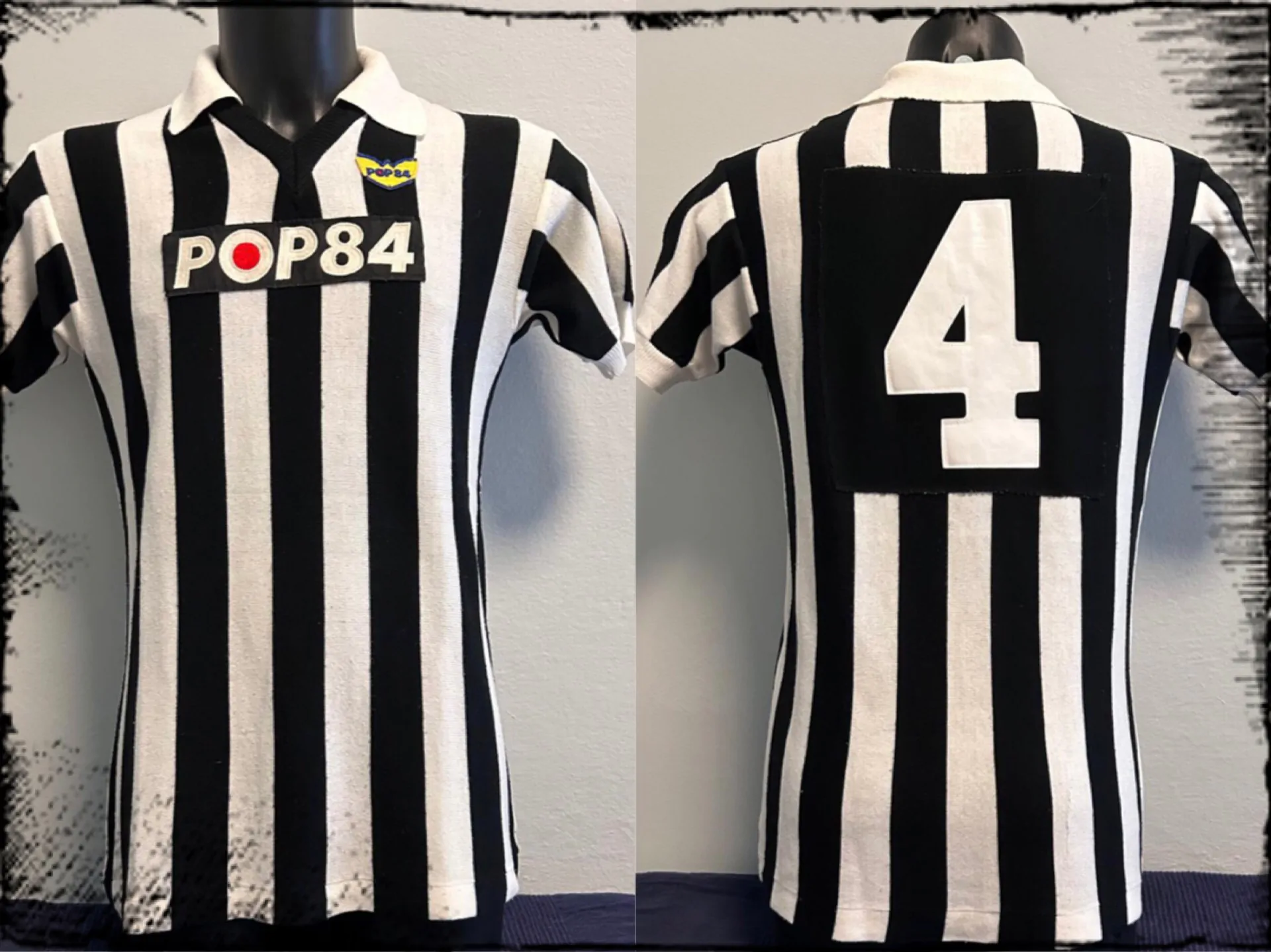 Si tratta di un modello simile a quello usato nell’ultima partita di campionato ma con la differenza delle righe più larghe. La maglia reca la toppa dello sponsor Pop84 cucita, così come lo stemma giallo dell’azienda molisana, famosa soprattutto per i jeans dell’epoca, cucito un po’ più sopra dello sponsor. Molto particolare il numero, in similpelle, cucito su un riquadro nero, a sua volta cucito alla maglia, una roba molto artigianale!