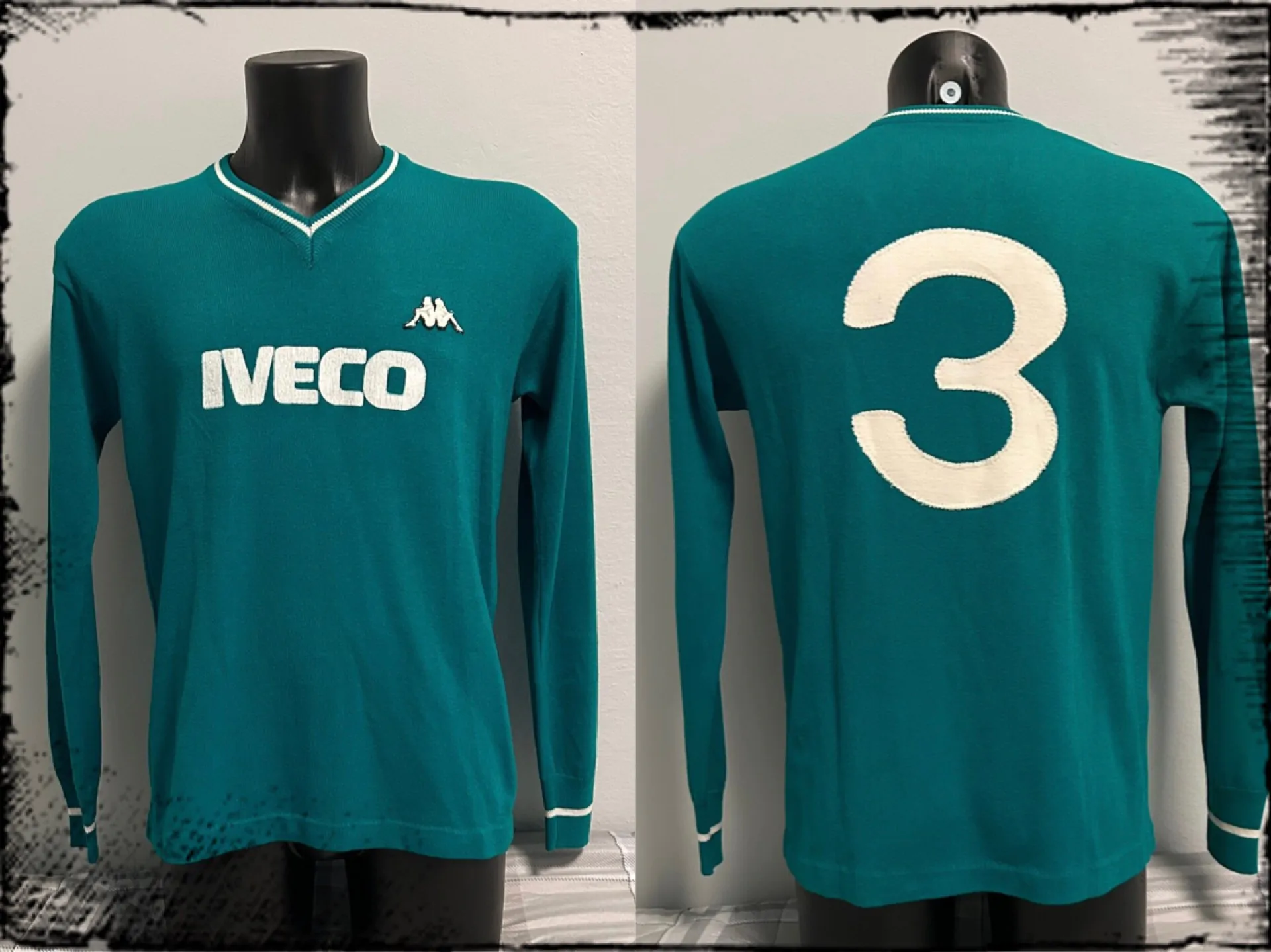 La curiosità legata a questa maglia è che, di base, si tratta di un modello prodotto dalla Ennerre negli anni Settanta ed utilizzato dall’Avellino con il marchio Robe di Kappa, sponsor tecnico dei biancoverdi solo per questa stagione. Le fattezze della maglia e l’assenza di etichette confermano tale assunto: la maglia è infatti con una striscia bianca nel colletto e nei polsini proprio come la maglia del Napoli della stagione 1976-77 già in mio possesso. Ad ulteriore conferma di ciò, anche il numero 3 sul retro, il classico utilizzato su maglie Ennerre, in panno.
