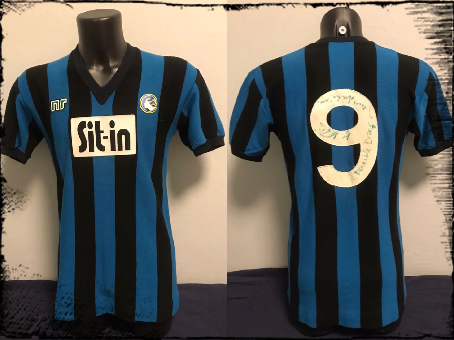 La maglia è appartenente alla stagione 1982-83 in cui compare per la prima volta sulle maglie nerazzurre uno sponsor commerciale, il marchio Sit-In, azienda produttrice di moquette ed erba sintetica. Lo sponsor era originariamente ricamato nella maglia, come si può vedere dalle foto di inizio campionato e dal dettaglio dello sponsor, poi, nel corso della stessa stagione 1982-83, fu coperto da una toppa in pelle recante sempre la scritta Sit-In su sfondo bianco, molto probabilmente per motivi di visibilità e così fu usata sia per quella stagione che per quella successiva, quella del 1983-84 in cui i nerazzurri di Nedo Sonetti dominarono il campionato di serie B e conquistarono la promozione in A.