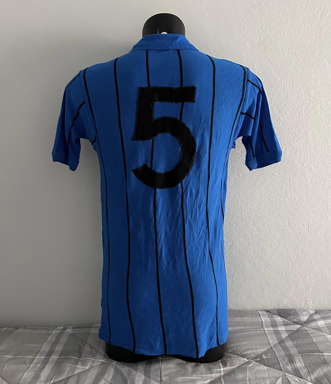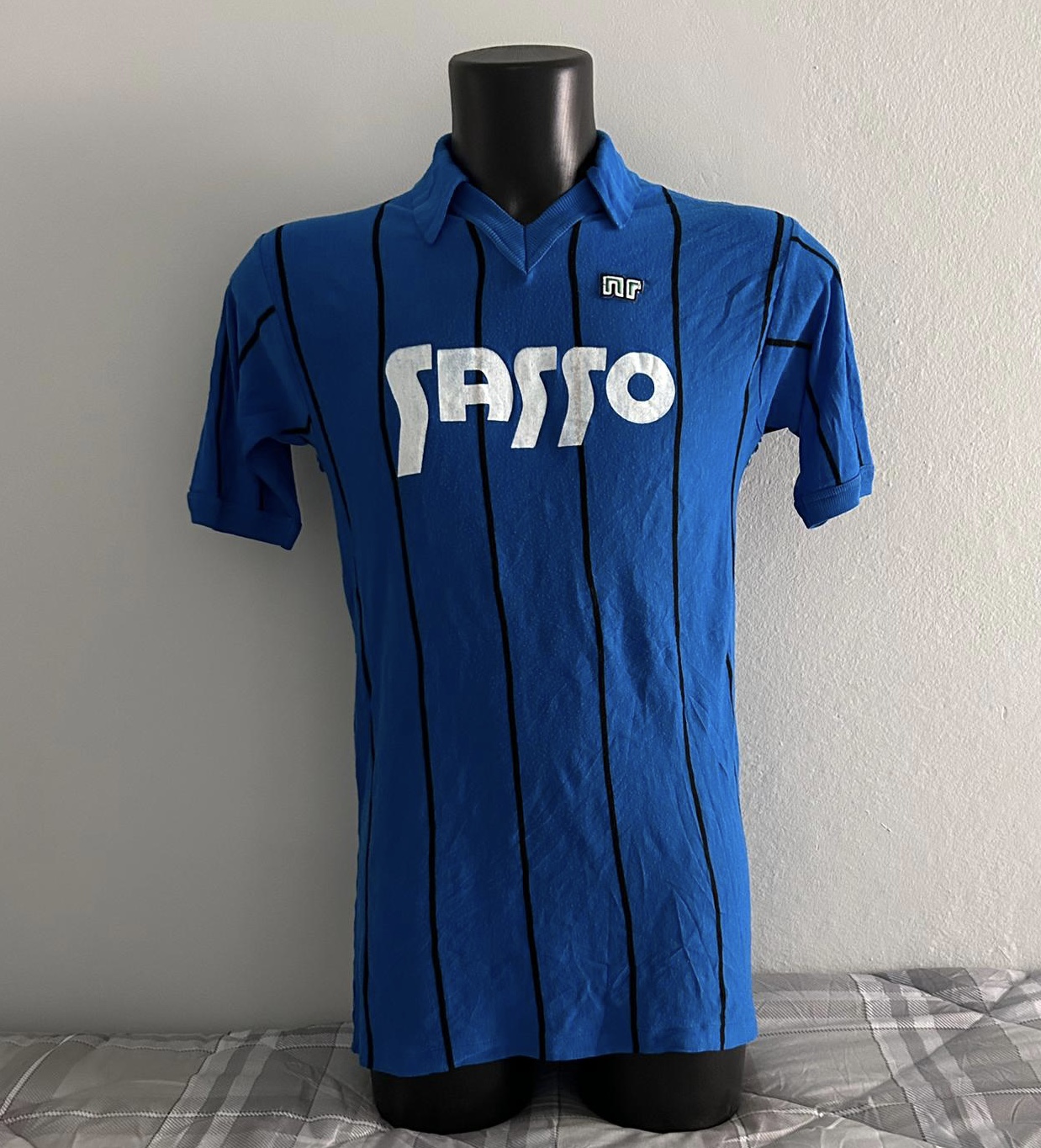 La maglia proviene direttamente da ex calciatore dell’Imperia ed è una bellissima versione in lanetta leggera (la si vede in foto), con sfondo azzurro e linee verticali nere proprio per ricreare i colori sociali. Prodotta da Ennerre, la maglia reca lo sponsor storico olio “Sasso”, il famoso brand alimentare ligure, originario di Oneglia, appunto frazione di Imperia. Molto bello anche il numero nero cucito sul retro della maglia.