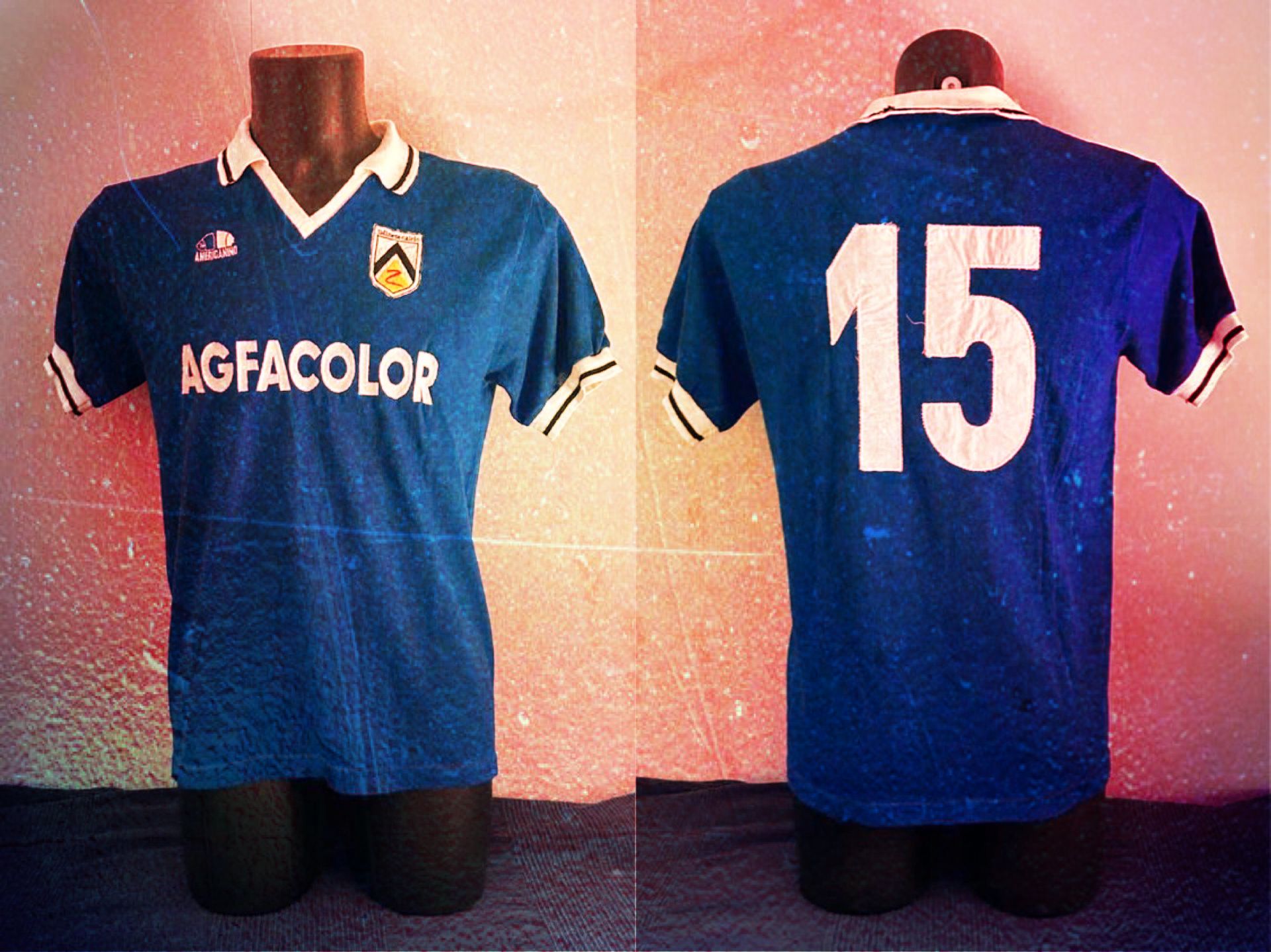 Si tratta di un bellissimo modello blu in lanetta leggera, con lo sponsor commerciale “Agfacolor” ricamato. La maglia reca anche lo stemma della Americanino, il produttore della maglia, in bianco e lo stemma sociale con la Z della Zanussi, società di elettrodomestici all’epoca presieduta, come il club friulano, da Lamberto Mazza, anche queste ricamate sulla maglia. Il colletto e i bordi manica sono bianchi con una striscia nera per richiamare i colori del club. Il numero 15 sul retro è bianco ed in stoffa.