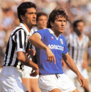Franco Pancheri, nella terza foto ritratto di spalle durante il match, indossò il numero 15 in quella partita. Cresciuto nelle giovanili dell’Inter, fece parte della squadra che vinse il tricolore nella stagione 1979-80.