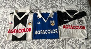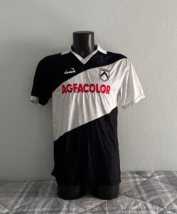 Oggi presentiamo una maglia molto iconica, la maglia dell’Udinese della stagione 1984-85, dove militava Edinho. Il “template” aveva una grande banda obliqua bianca, su sfondo nero ed è diventato uno dei più iconici della squadra friulana. Come anche la precedente maglia di Gerolin della stagione 1983-84, anche questa arriva dal lontano Brasile.