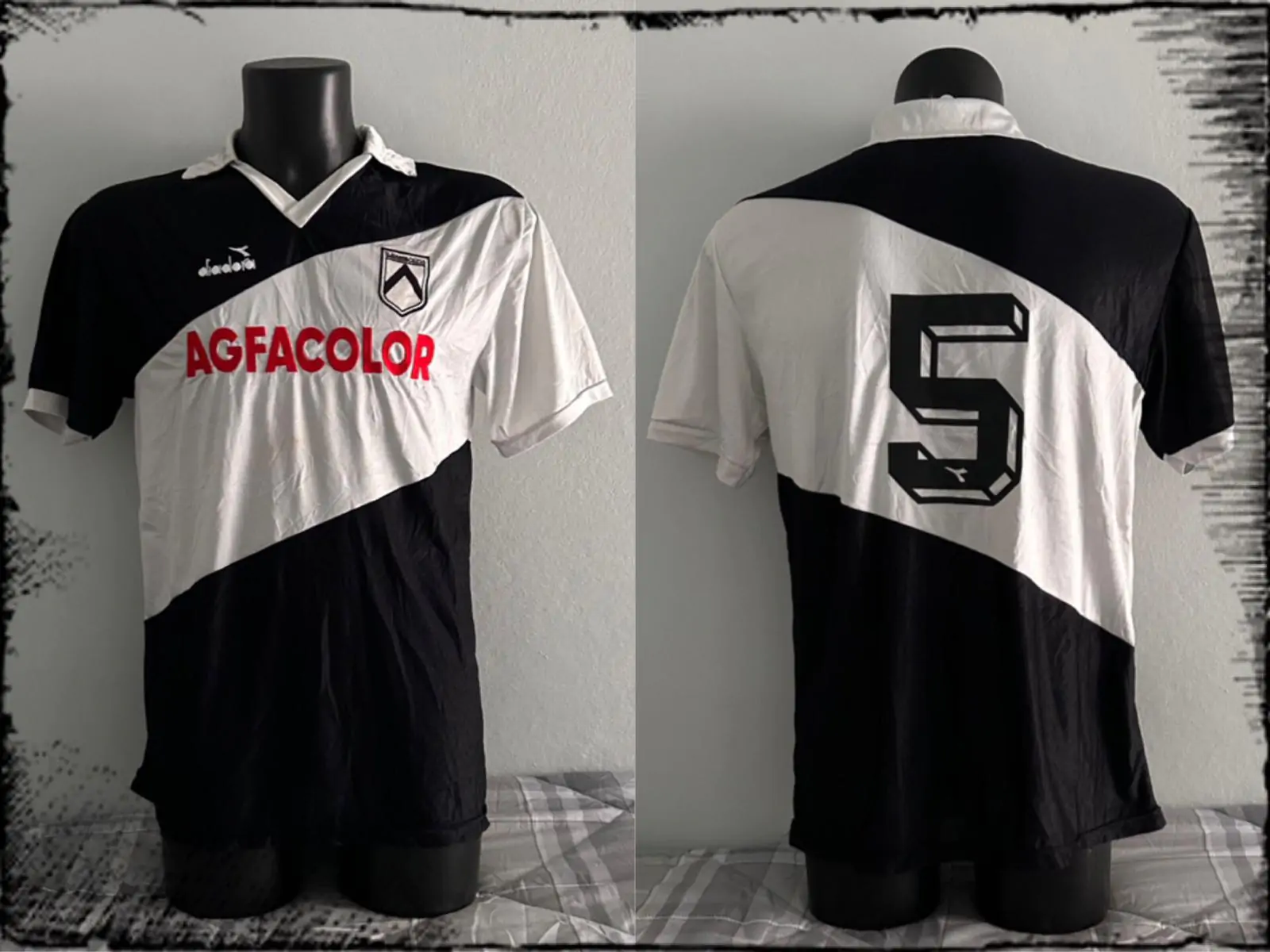Oggi presentiamo una maglia molto iconica, la maglia dell’Udinese della stagione 1984-85, dove militava Edinho. Il “template” aveva una grande banda obliqua bianca, su sfondo nero ed è diventato uno dei più iconici della squadra friulana. Come anche la precedente maglia di Gerolin della stagione 1983-84, anche questa arriva dal lontano Brasile.