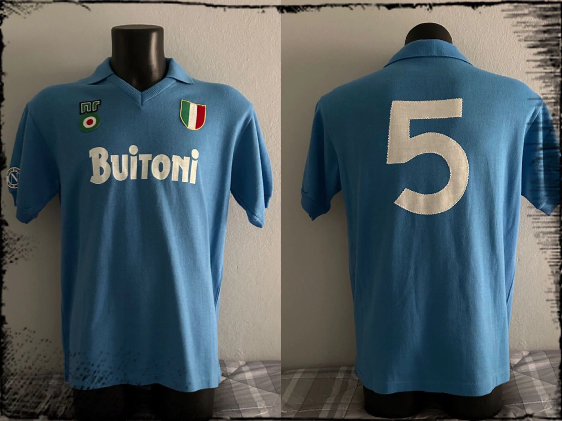 La maglia, come dicevo è quella classica, un modello a manica corta, piuttosto iconico come dicevo più sopra: sempre prodotta dalla mitica Ennerre, reca in formato più piccolo rispetto al modello precedentemente descritto, lo sponsor “Buitoni”, la celebre azienda alimentare che ha accompagnato il Napoli per tre stagioni, oltre ovviamente alle “patch” dello scudetto e la coccarda tricolore che hanno fatto spostare lo stemma societario sulla manica destra: in questo modello, a differenza che nella versione estiva, lo stemma risulta sempre cucito sulla maglia. Il numero 5 ha la forma più “panciuta”, rispetto a quella tradizionale, vale a dire con la parte inferiore e superiore del numero molto più ravvicinate, rispetto al numero 5 tradizionale.