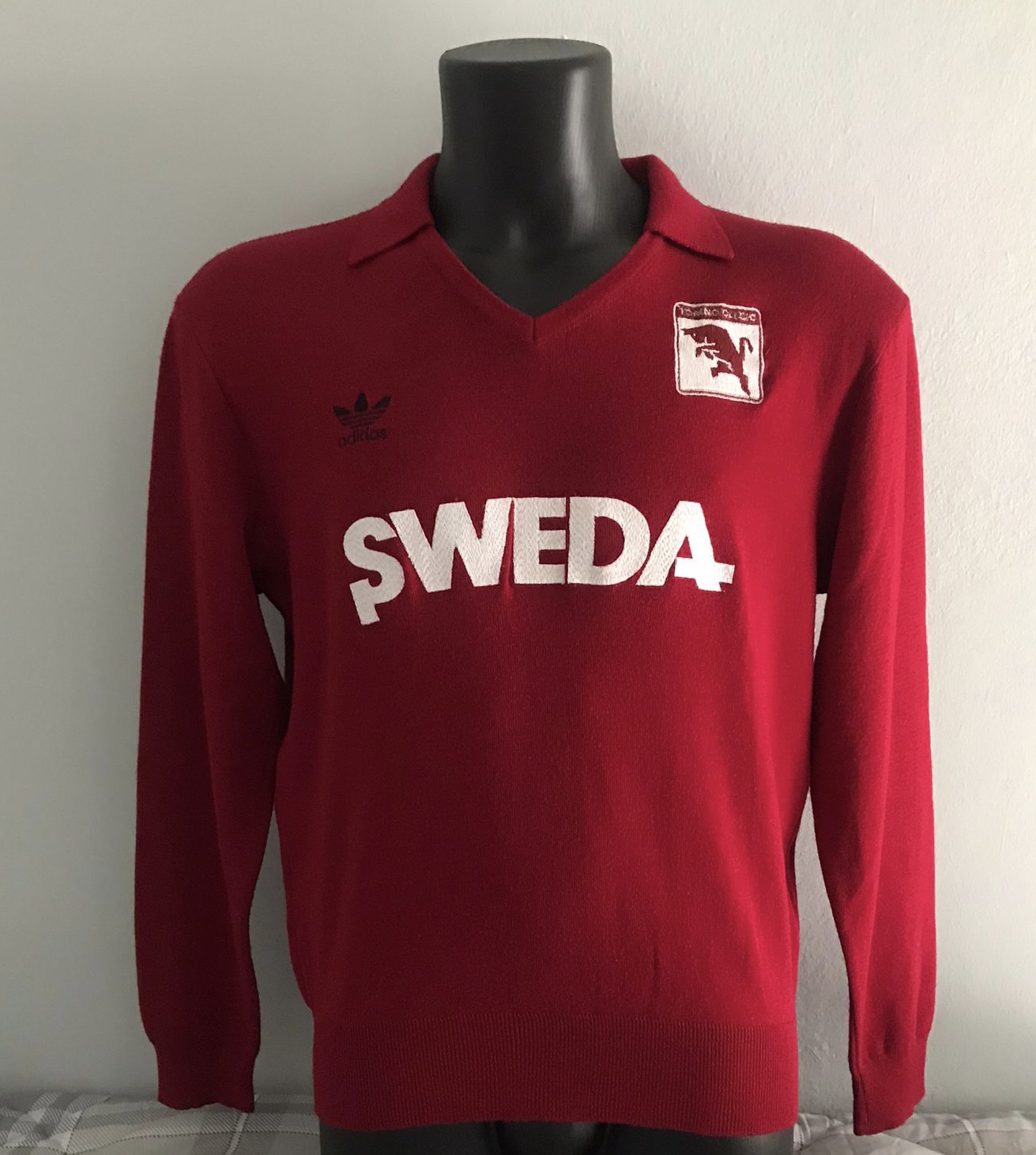 La maglia è semplicemente straordinaria, una specie di felpa della Best Company tanto in voga negli anni 80, ovviamente in lanetta e con elastico all’estremità in basso, completamente ricamata nello sponsor Sweda, nello stemma (quello classico del Toro rampante anni ’80 che sostituì il Toro “Nasone” presente invece sulle maglie Umbro dei primi anni ’80) e nel trifoglio Adidas.