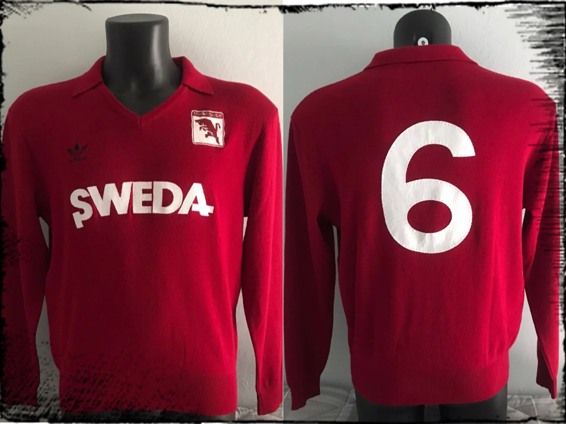 La maglia è semplicemente straordinaria, una specie di felpa della Best Company tanto in voga negli anni 80, ovviamente in lanetta e con elastico all’estremità in basso, completamente ricamata nello sponsor Sweda, nello stemma (quello classico del Toro rampante anni ’80 che sostituì il Toro “Nasone” presente invece sulle maglie Umbro dei primi anni ’80) e nel trifoglio Adidas.