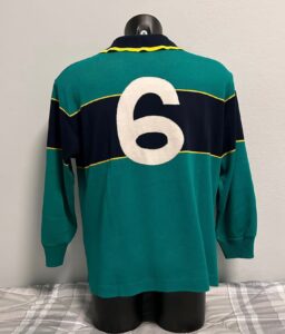 La maglia ha tutte le caratteristiche Ennerre con numero 6 cucito sul retro perfettamente e in classico acrilico pesante tanto a me caro. Molto bello è anche il richiamo al colore giallo del Leone Alato che troviamo sui bordi del colletto e sulle strisce che limitano la banda nera centrale.