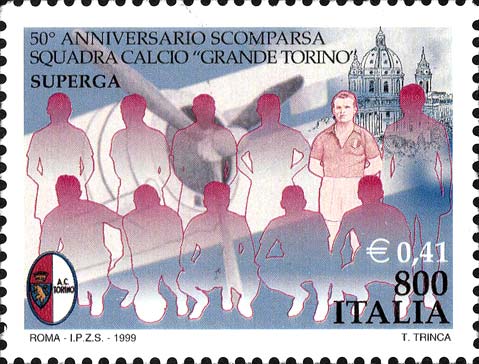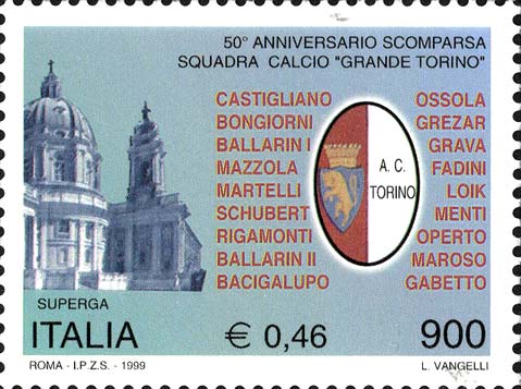 La prima volta avvenne il 4 maggio 1999: due francobolli emessi per il cinquantenario della sciagura di Superga. Un 800 lire e un 900 lire: nel primo appare una squadra con delineati solo i margini, nessun volto. In evidenza invece il solo Capitano. Nel secondo ci sono scritti tutti i nomi dei giocatori scomparsi in quella tragica giornata.