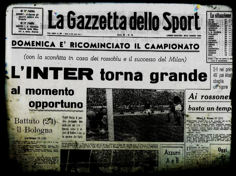 […] Cosa resta di quel Bologna Inter che valeva uno scudetto per entrambe? Rimane tutto. Memoria pura. Anche se è difficile ‘sentire’ la tensione e le vibrazioni di quel marzo ’64 (la Pasqua cadeva il 29, e non era un sabato come il 3 prossimo aprile). Iniziamo così questo viaggio nel passato con l’articolo del Corriere della Sera, il giorno dopo il match: «Ha vinto l’Inter, ma ha vinto anche Bologna. E se la vittoria dell’Inter è stata limpida – scaturita da una superiorità indiscutibile – la vittoria della folla bolognese è stata esaltante: una prova di maturità civica che affonda le sue radici nel buon senso, nella ‘misura’, nell’orgoglio della gente emiliana…», per concludersi ecumenicamente con un «Così ha vinto lo sport» […]