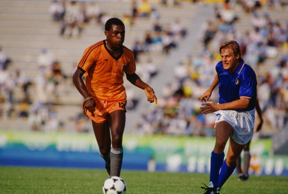 Kalusha Bwalya of Zambia (centre) on the pitch during the Zambia v Italy match during the 1988 Summer Olympics, Gwangju Mudeung Stadium, South Korea, 19th September 1988. Bwalya scored a hat-trick in the game and Zambia went on to beat Italy 4 - 0. (Photo by Bob Thomas/Getty Images)
