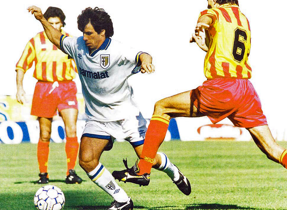 […] Da Napoli andò via per motivi economici, tra il dolore della gente, la società aveva bisogno di soldi e fu costretta a vendere i migliori. Andò al Parma, quello grande di Nevio Scala, poi nel 1994 ai Mondiali negli Usa, e qui la sua sofferenza: all’ esordio venne espulso dall’arbitro Brizio per fallo inesistente. […] Con il Parma vinse la Supercoppa Uefa e la Coppa Uefa. Nonostante l’amarezza statunitense, era ormai un campione che però ebbe contrasti con il nuovo allenatore Ancelotti per averlo spostato alla sinistra del centrocampo. Troppo lontano da se stesso. Meglio andare via. Londra, Chelsea, a trent’anni.